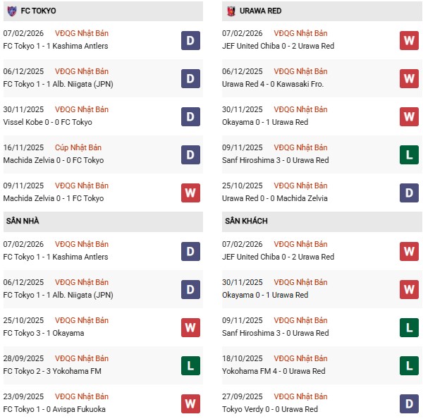 Phong độ 10 trận gần nhất của Urawa Reds khá cân bằng với 4 chiến thắng, 3 trận hòa và 3 thất bại. Trên sân khách, họ thắng 3, hòa 3 và thua 4 trong 10 chuyến xa nhà gần đây – thành tích chưa thật sự nổi bật nhưng đủ cho thấy khả năng cạnh tranh khi thi đấu xa tổ ấm. Trước một FC Tokyo thi đấu kỷ luật, Urawa nhiều khả năng sẽ ưu tiên sự chặt chẽ và chờ đợi thời cơ phản công.