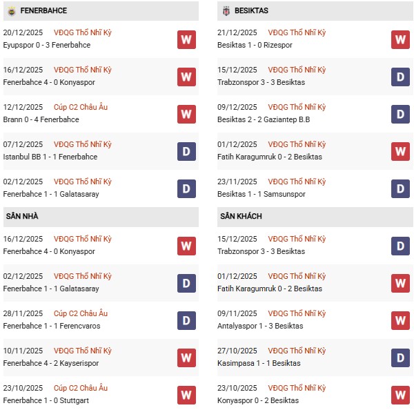 Thành tích đối đầu Fenerbahce vs Besiktas: