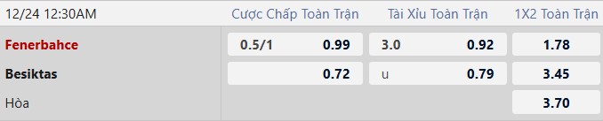 Thông tin tỷ lệ kèo Fenerbahce vs Besiktas: