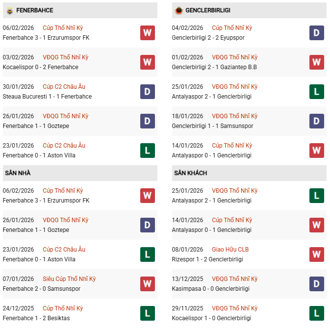 Thống kê đối đầu Fenerbahce vs Genclerbirligi: