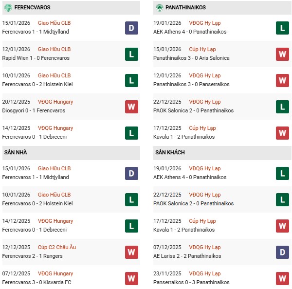 Thống kê phong độ Ferencvaros vs Panathinaikos: