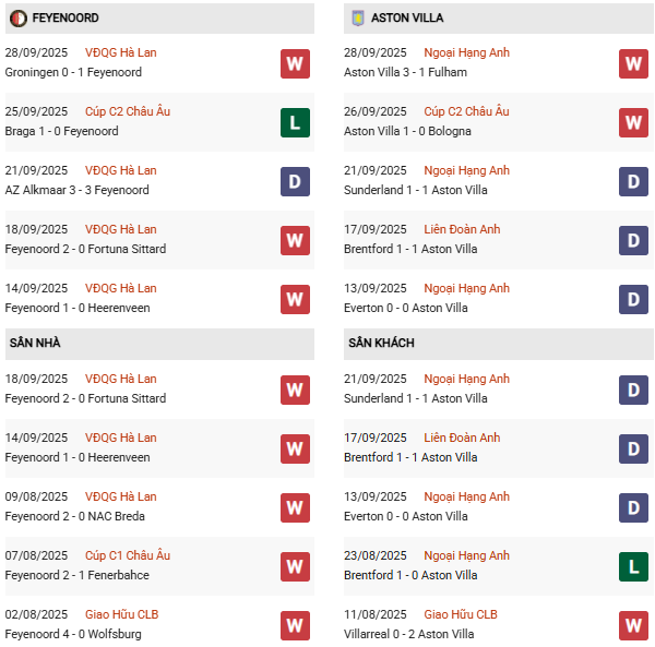 Thống kê phong độ Feyenoord vs Aston Villa: