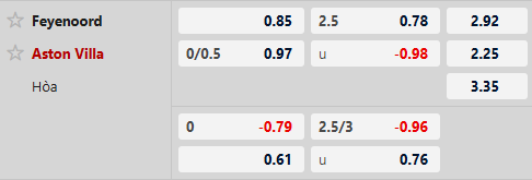 Thông tin tỷ lệ kèo bóng đá Feyenoord vs Aston Villa: