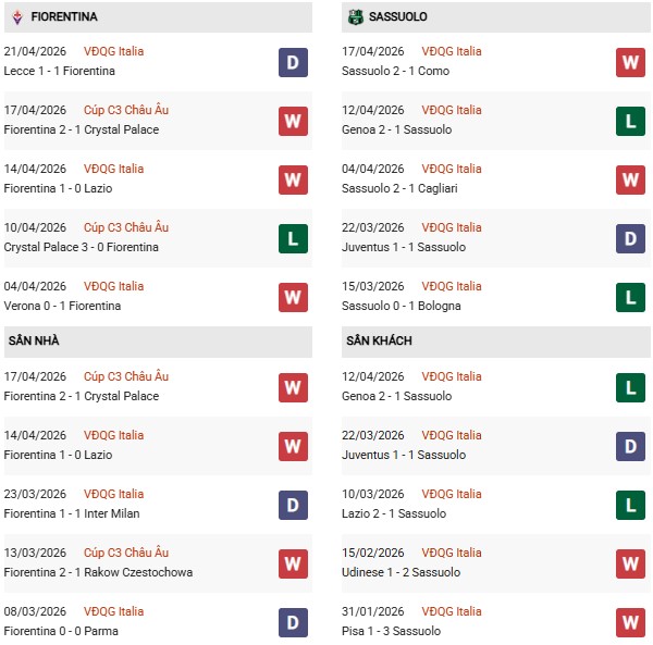 Đáng chú ý, khả năng du đấu của đội khách đang là một dấu hỏi lớn khi họ không thắng trong 3 trận sân khách gần đây (thua 2, hòa 1). Khi động lực thi đấu không còn quá gay gắt, Sassuolo có thể sẽ không chơi với 100% khả năng trước một Fiorentina đang khát điểm.
