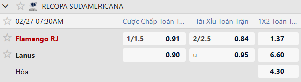 Thông tin tỷ lệ kèo Flamengo vs Lanus: