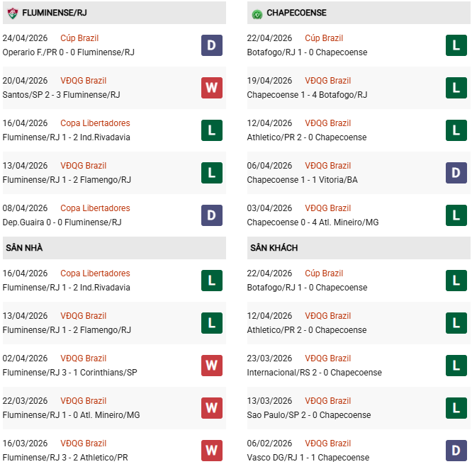 - Trên sân nhà, Fluminense thắng 2, thua 3 trước Chapecoense.