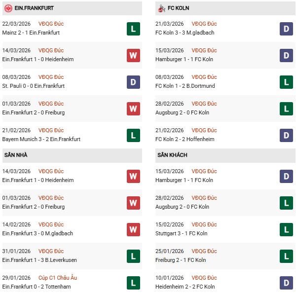 - Frankfurt thắng 2, hòa 5, thua 3 trong 10 trận gặp FC Koln gần đây.