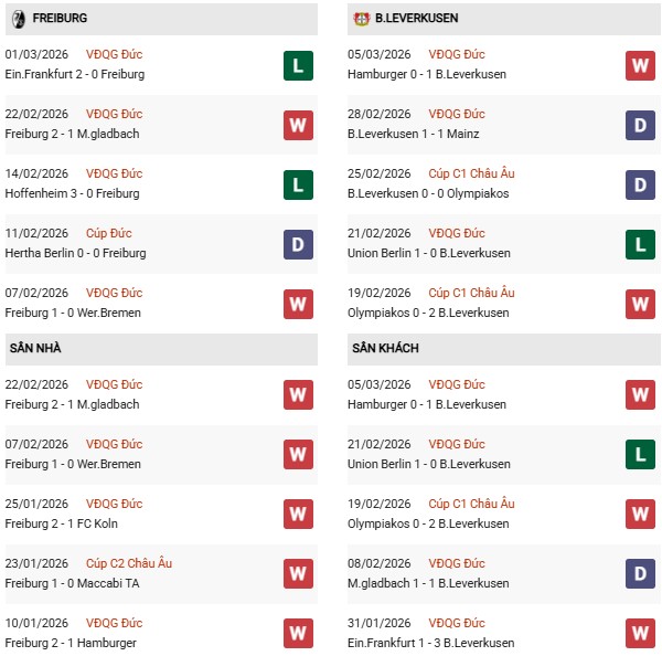 - Trên sân nhà, Freiburg thắng 2, thua 3 trước Leverkusen.