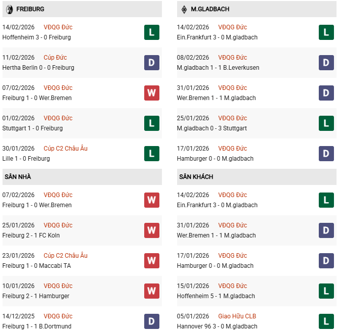 - Freiburg thắng 4, hòa 5, thua 1 trong 10 trận gặp M'Gladbach gần đây.