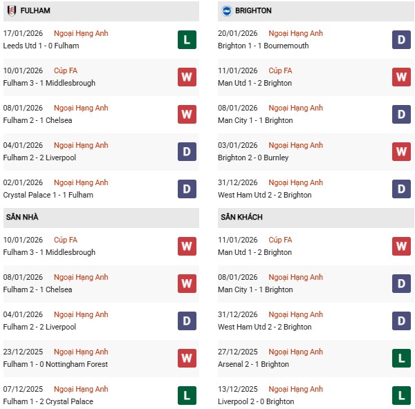 Quyết tâm nhanh chóng gạt bỏ cú sảy chân tại Elland Road, Fulham kỳ vọng sự trở lại Craven Cottage sẽ mang đến cú hích cần thiết. Mùa này, họ giành tới 64,5% tổng số điểm tại Ngoại hạng Anh trên sân nhà (20/31 điểm), thắng 6 trong 11 trận và ghi được 19 bàn thắng. Đáng chú ý, Fulham đang bất bại trong cả 5 lần tiếp Brighton trên sân nhà tại Ngoại hạng Anh (thắng 4, hòa 1), bao gồm chiến thắng 3-1 ở mùa giải trước, sau khi từng thua liền 3 trận trước đối thủ này tại Championship.