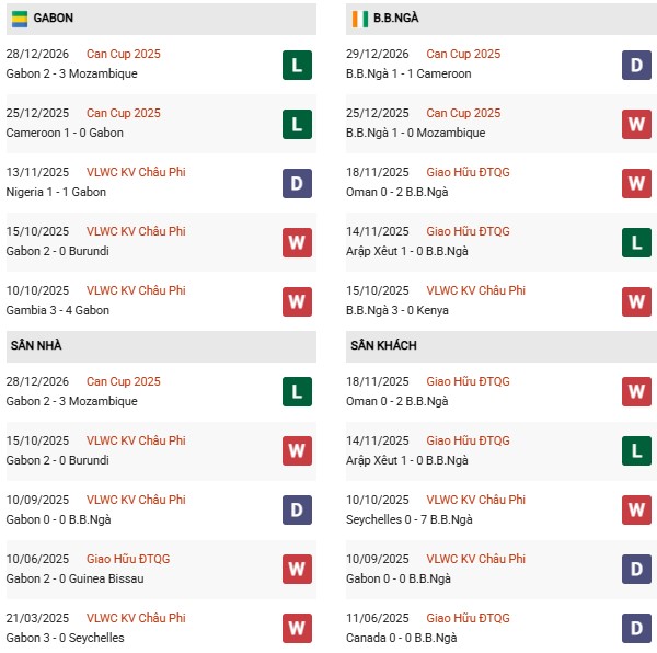 Thống kê phong độ Gabon vs Bờ Biển Ngà: