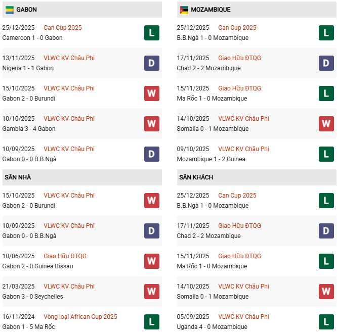 Trong một chừng mực nào đó, Gabon được giới chuyên môn đánh giá cao hơn Mozambique ở trận chiến sắp tới. Trước khi để thua Cameroon 0-1 ở lượt ra quân tại AFCON 2025, Gabon đang trải qua mạch 6 trận bất bại, bao gồm 4 chiến thắng và 2 trận hòa.