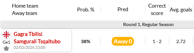 Phía bên kia chiến tuyến, Samgurali Tskaltubo cũng vừa trải qua một mùa bóng đầy cảm xúc khi giành vị trí thứ 7 với 42 điểm, chỉ kém chính Gagra đúng 1 điểm duy nhất. Samgurali là một trong những đội bóng có lối chơi cống hiến bậc nhất giải đấu mùa trước với 54 pha lập công. Sự cân bằng suýt soát về điểm số giữa hai đội hứa hẹn một màn so tài rực lửa ngay trong ngày ra quân của mùa giải mới 2026.