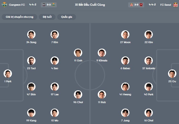 Đội hình dự kiến Gangwon vs FC Seoul:
