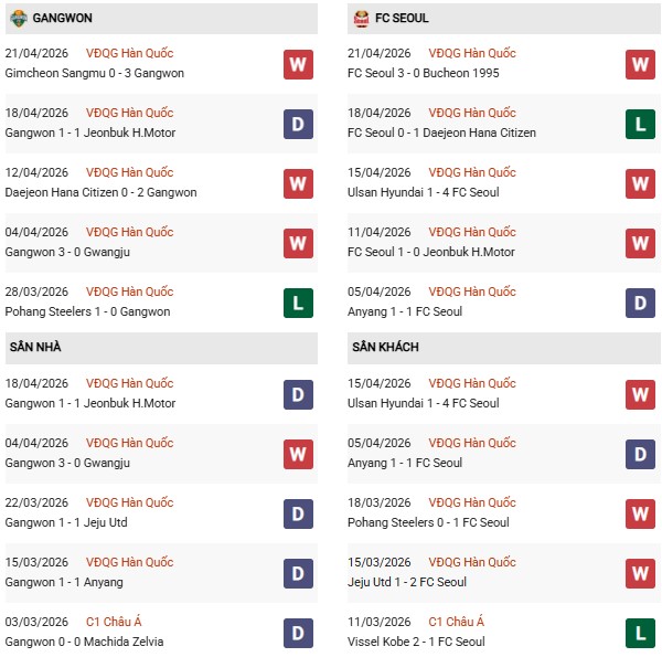 Thống kê phong độ Gangwon vs FC Seoul: