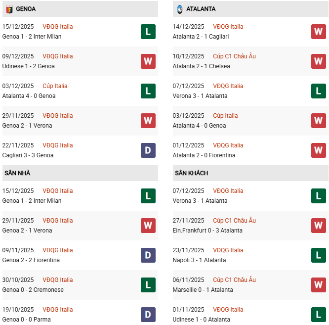 Phong độ của Genoa vs Atalanta rất chênh lệch. Genoa có lợi thế sân nhà nhưng Atalanta lại vượt trội về nhiều mặt. Nhiều khả năng, trận đấu này sẽ kết thúc với thắng lợi thuộc về Atalanta.