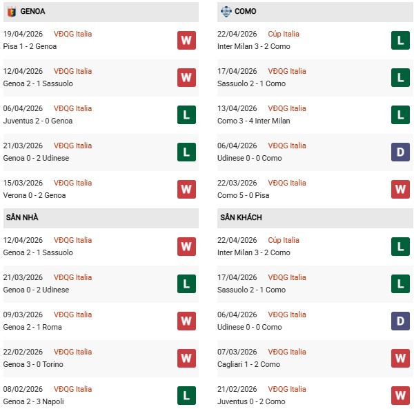 - Genoa thắng 1, hòa 4, thua 2 trong 7 trận gặp Como gần đây.