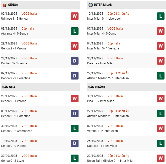 Dù vậy, thày trò HLV Chivu đã có một chiến thắng ấn tượng trước Como với tỷ số 4-0 ở vòng trước. Hơn nữa, Inter cũng có phong độ sân khách khá ấn tượng khi chỉ thua 1, thắng 4 ở 5 chuyến xa nhà gần đây tại Serie A. Song, có điều cần nhấn mạnh rằng, Genoa thi đấu rất tệ khi đối đầu với Inter. Họ đã không thắng đối thủ này ở 12 trận đụng độ gần nhất tại Serie A, trong đó có 9 thất bại và 3 trận hòa.