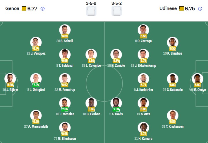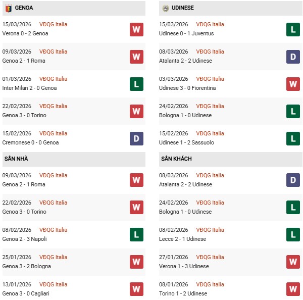 Ở trận đấu gần nhất, Genoa và Udinese có kết quả trái ngược tại Serie A 2025/26. Trong khi Genoa đánh bại Verona với tỷ số 2-0 thì Udinese thua 0-1 trước Juventus.