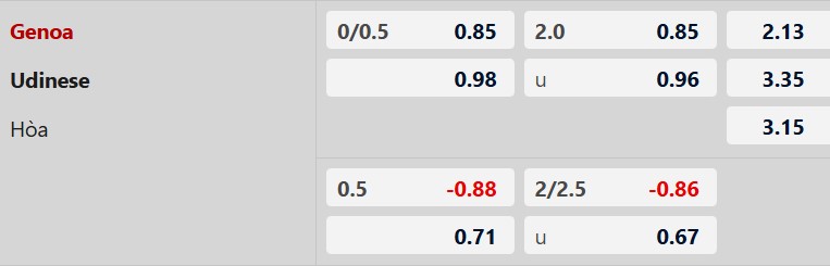 Lẻ bàn thắng: 8/9 trận gần nhất của Genoa có tổng bàn thắng không chia hết cho 2. Chưa hết, 7/9 trận mới đây của Udinese chứng kiến điều tương tự.