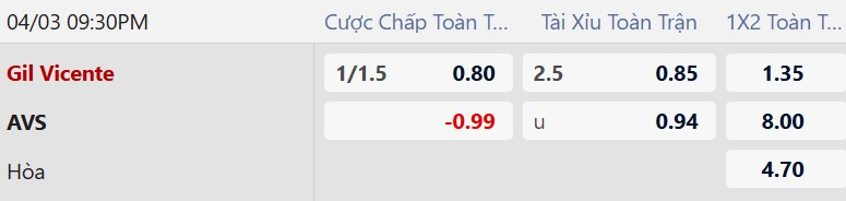 Thông tin tỷ lệ Gil Vicente vs AVS: