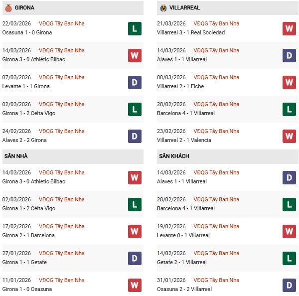 Thống kê phong độ Girona vs Villarreal:
