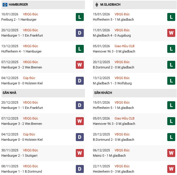 - Hamburger thắng 4, hòa 4, thua 2 trong 10 trận gặp M'gladbach gần đây.