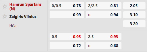 Thông tin tỷ lệ bóng đá Hamrun Spartans vs Zalgiris: