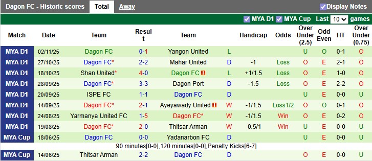 Phong độ 10 trận gần nhất của Dagon FC là thắng 3, hòa 5 và thua 2, trong đó điểm sáng lớn nhất đến từ thành tích sân khách. Cụ thể, Dagon FC thắng 6, hòa 3 và chỉ thua 1 trong 10 chuyến làm khách gần đây. Đây là cơ sở quan trọng giúp đội khách tự tin hướng tới một kết quả tích cực trước Hantharwady.
