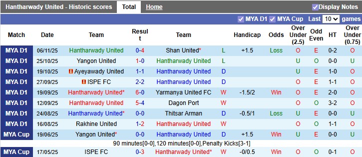 Thống kê phong độ Hantharwady vs Dagon FC: