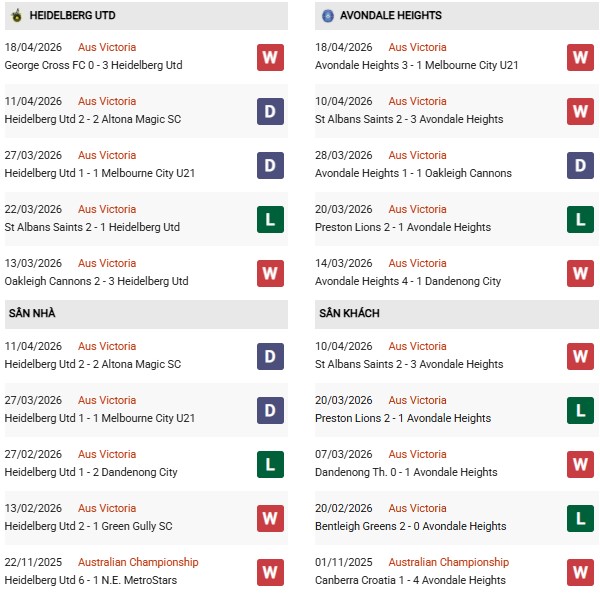 - Trên sân nhà, Heidelberg United thắng 4, thua 2 trước Avondale.