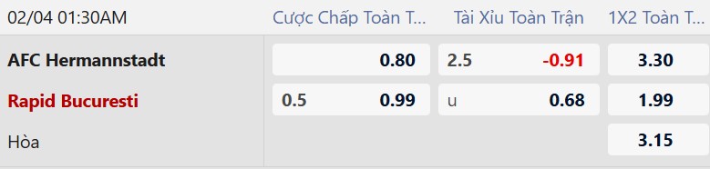 Thông tin tỷ lệ Hermannstadt vs Rapid Bucuresti:
