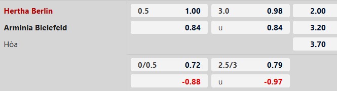 Hertha Berlin thắng theo châu Á: Hertha Berlin thắng 6, hòa 1 ở 8 trận gần nhất trên mọi đấu trường; thắng 5, hòa 1 ở 7 trận sân nhà vừa qua. Còn Arminia Bielefeld thua cả 4 trận gần đây, thua 5/7 chuyến làm khách gần nhất. Trận này nhiều khả năng sẽ khép lại với Hertha thắng theo châu Á.