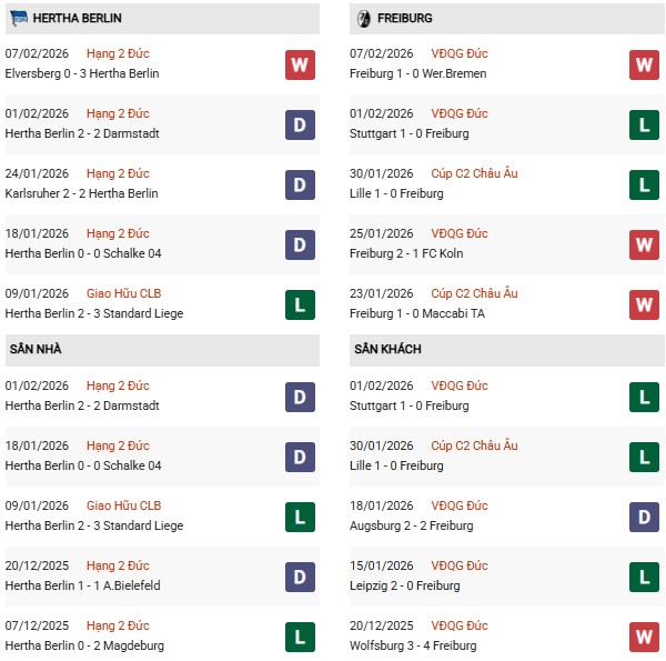 - Trên sân nhà, Hertha Berlin thắng 3, thua 3 trước Freiburg.