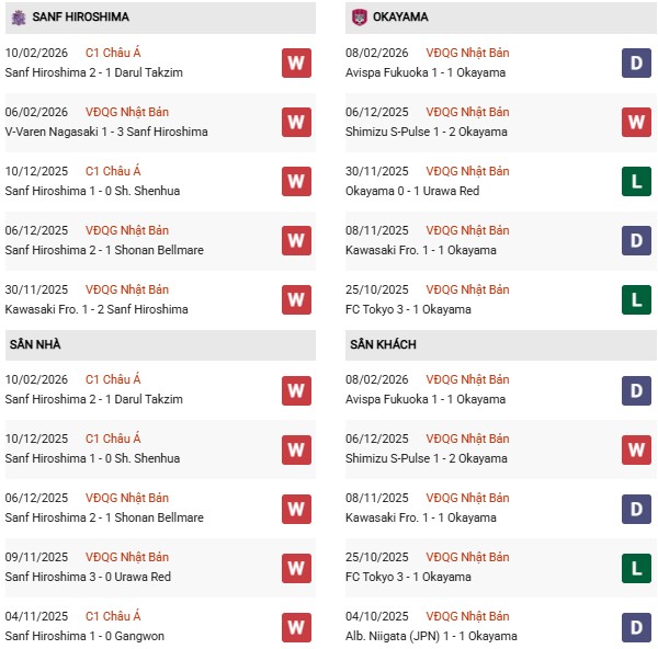 - Trên sân nhà, Hiroshima thắng 2, thua 2 trước Okayama.