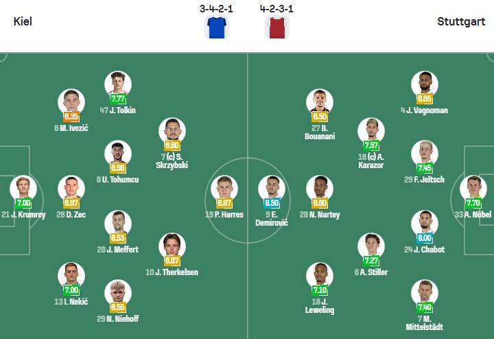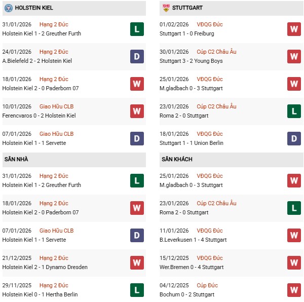 - Trên sân nhà, Holstein Kiel thắng 1, thua 1 trước Stuttgart.