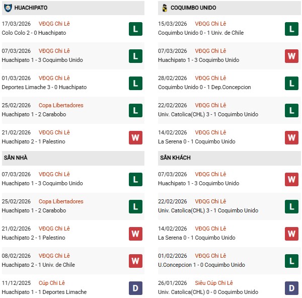 - Trên sân nhà, Huachipato thắng 3, thua 4 trước Coquimbo.