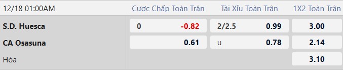 Thông tin tỷ lệ bóng đá Huesca vs Osasuna: