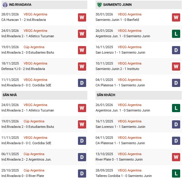 - Trên sân nhà, Ind.Rivadavia thắng 2, thua 3 trước Sarmiento.