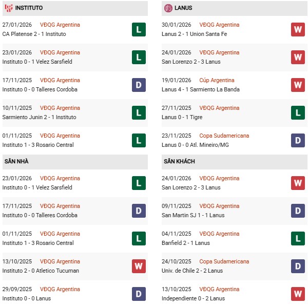 - Instituto Cordoba thắng 2, hòa 3, thua 3 trong 8 trận gặp Lanus gần đây.