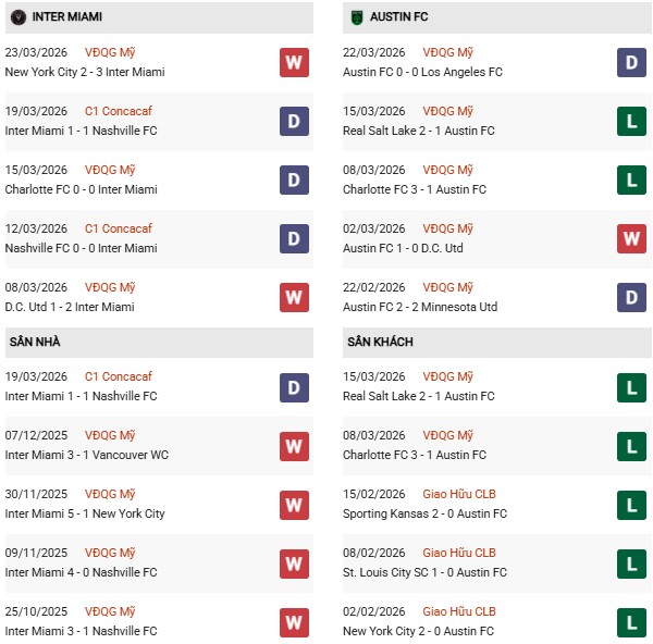 Thống kê phong độ Inter Miami vs Austin: