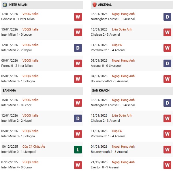Thống kê phong độ Inter Milan vs Arsenal: