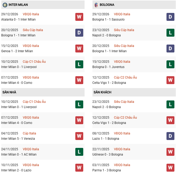 - Trên sân nhà, Inter Milan thắng 4, thua 2 trước Bologna.
