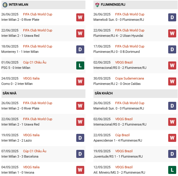 Thành tích đối đầu Inter Milan vs Fluminense: