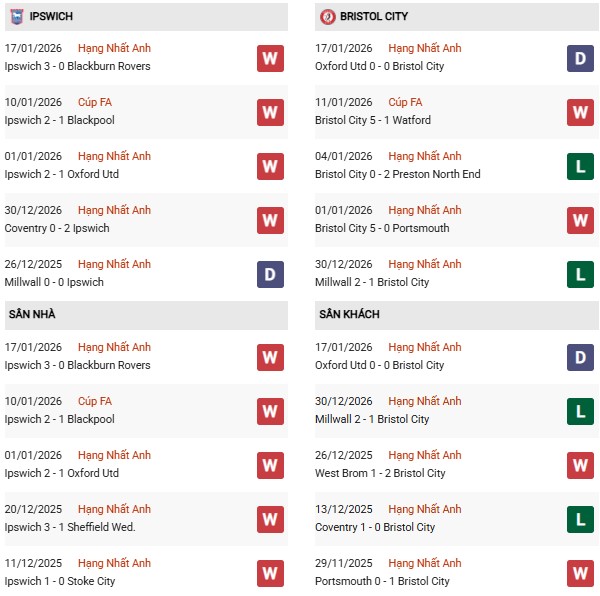 - Trên sân nhà, Ipswich thắng 5, thua 2 trước Bristol City.