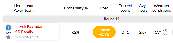 So tài cùng SD Family trở thành cơ hội để Irtysh Pavlodar nối dài ngày vui. Irtysh Pavlodar khả năng cao sẽ giành chiến thắng bởi SD Family đã và đang sa sút về thành tích.