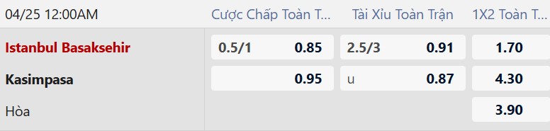 Thông tin tỷ lệ bóng đá Istanbul Basaksehir vs Kasimpasa:
