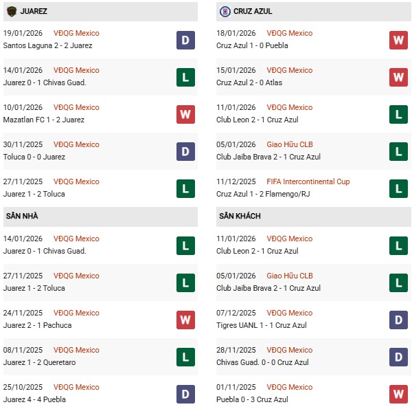 - Juarez thắng 2, hòa 2, thua 6 trong 10 trận gặp Cruz Azul gần đây.