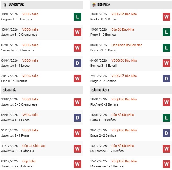 Juventus là thử thách đáng gờm cho Benfica khi họ không thua 10 trận gần nhất trên sân nhà. Dù thế, sân khách cũng chẳng phải là thử thách đáng sợ với Benfica, khi thắng 7, hòa 1 và thua 1 ở 9 trận sân khách gần nhất.