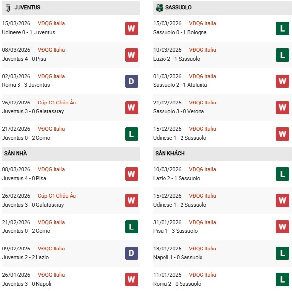 Thống kê phong độ Juventus vs Sassuolo: